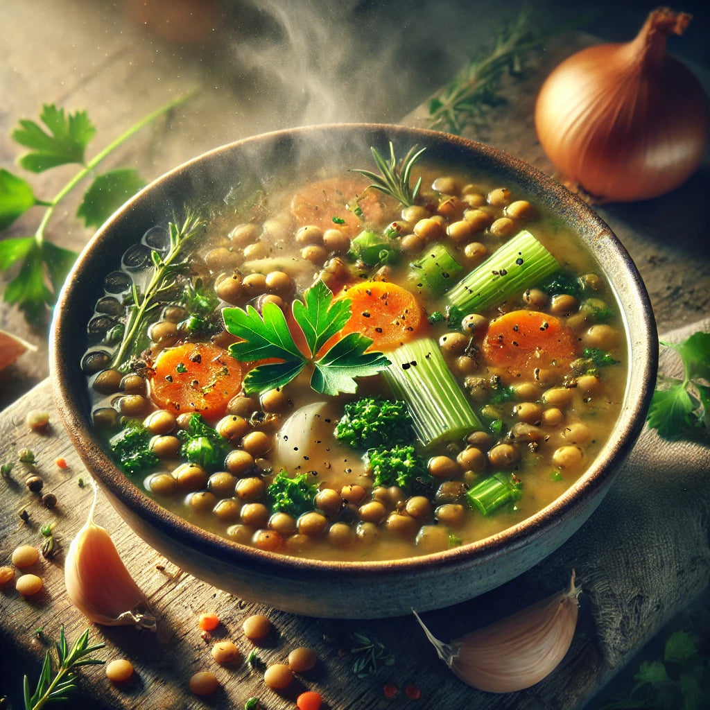 • Ingredients: • 300 ml bone broth • 300 ml water • 1 tbsp olive oil • 1 garlic clove, minced • 100 g lentils, rinsed • 50 g diced carrots • 50 g diced celery • 50 g diced...